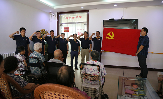 随后,公司党员骨干、共青团员和青年志愿者们来到潍城区康华老年会所。在敬老院,“红马甲”们为老人送去了米面油等生活物资,打扫屋内院内卫生,陪老人聊天解闷,忙碌而温馨的场面,洋溢着暖暖的爱意。在老人们的见证下,公司党员骨干在党旗下下庄严宣誓,要不忘初心,牢记使命,竭诚为民。